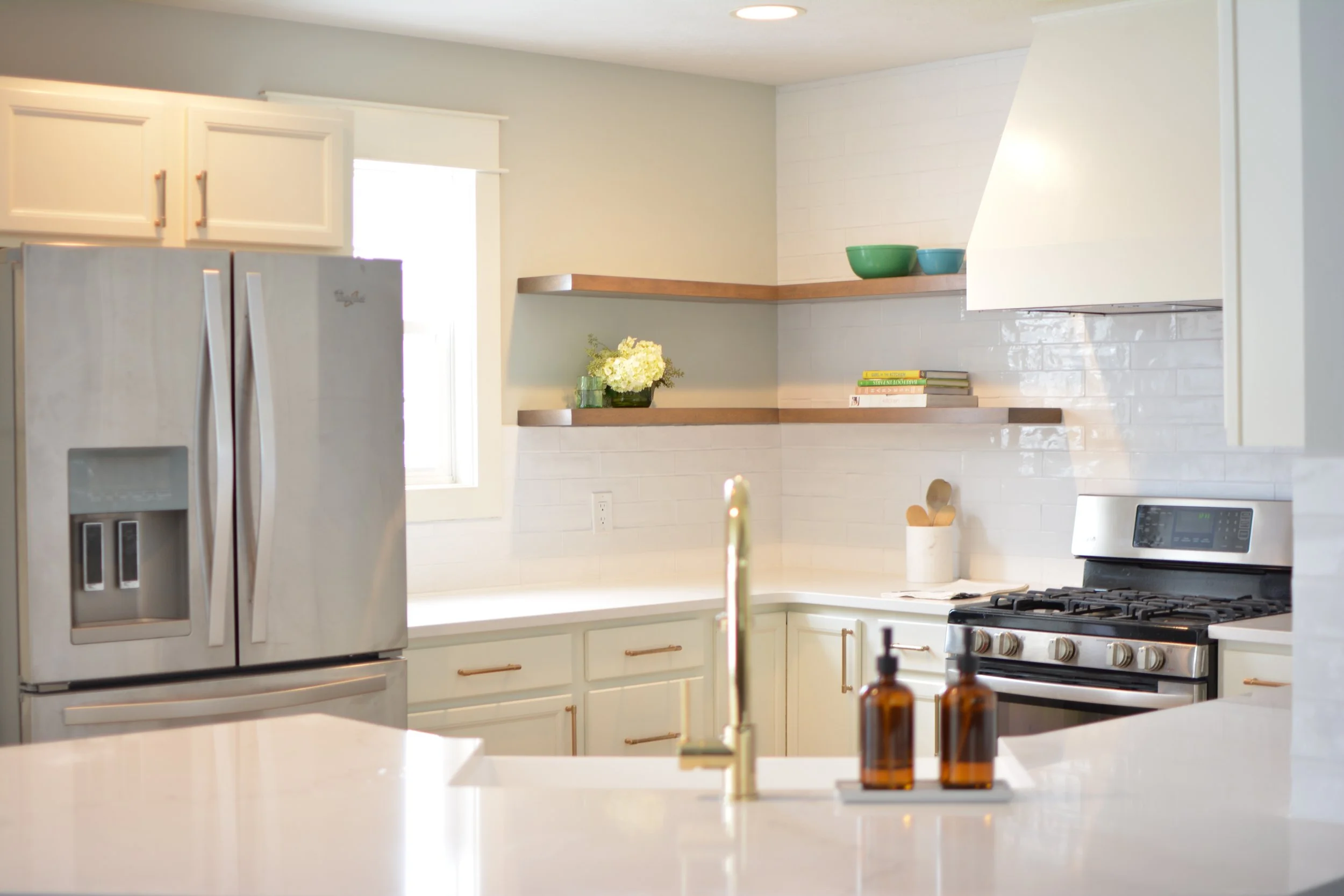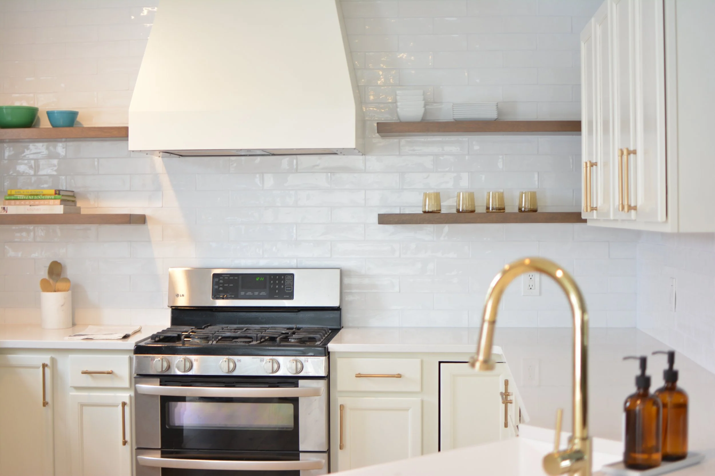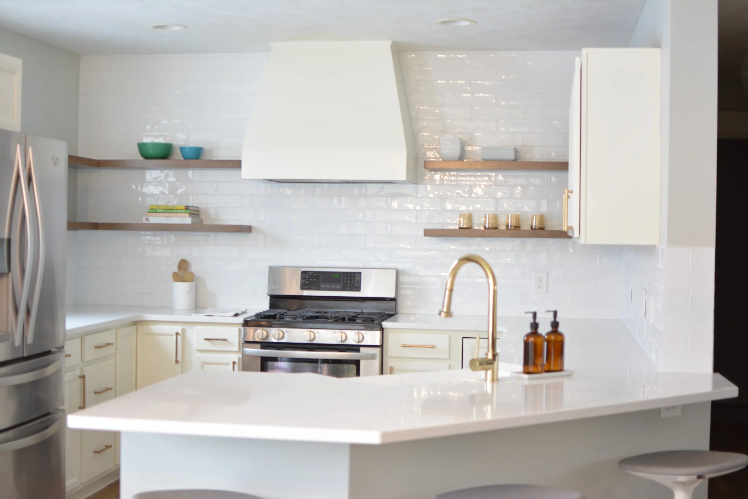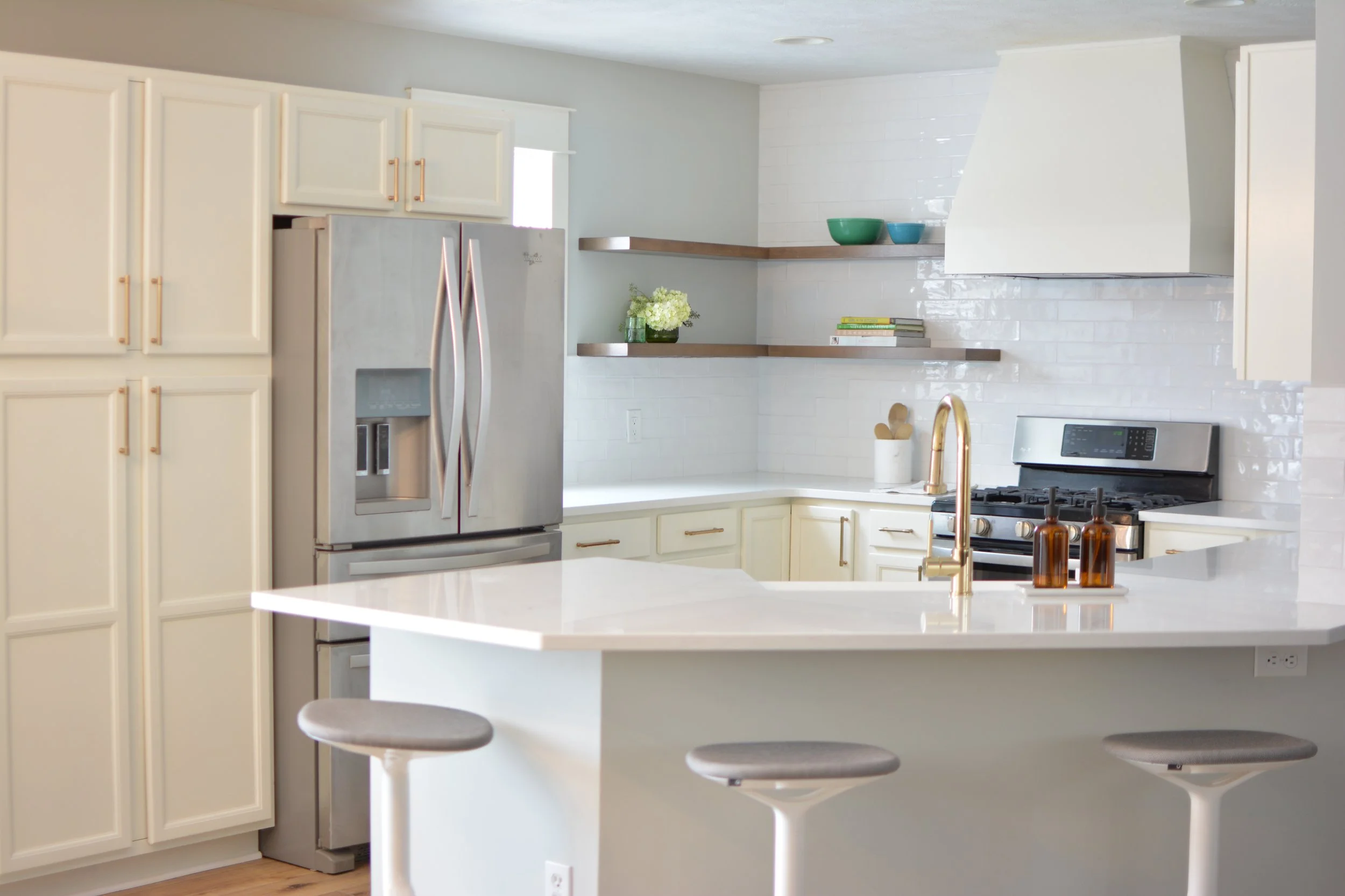 Kitchen remodel “lite”. This project really transformed the space without being a complete overhaul. New flooring, tile and countertops took us a long way. We removed some cabinetry, built a new hood, and brought down the bar height countertop to make the space feel more open and inviting.